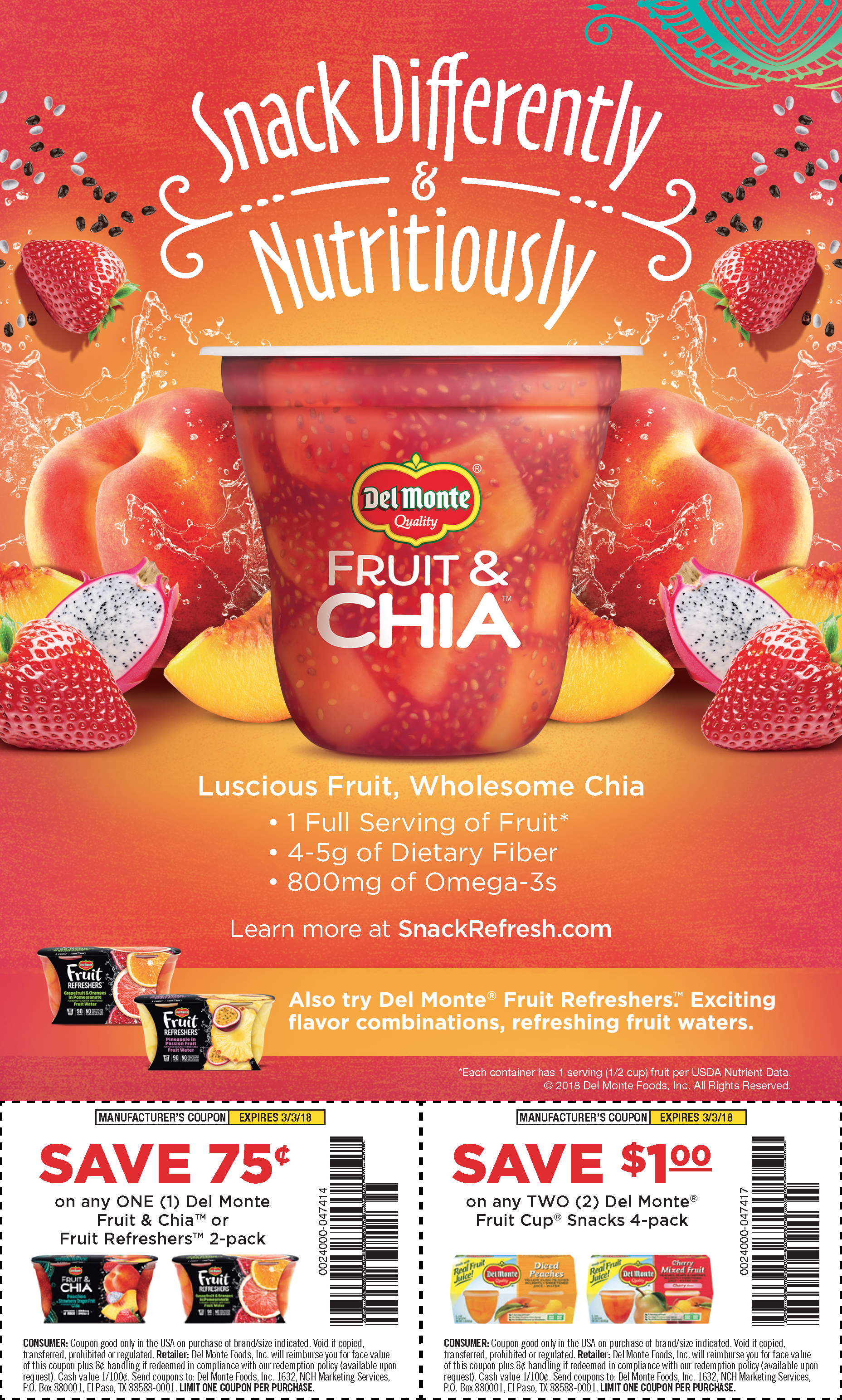 Del Monte Fruit & Chia fruit cups combine delicious fruit with a boost of nourishing chia to give adults a cup full of flavor, fiber, and omega-3s.